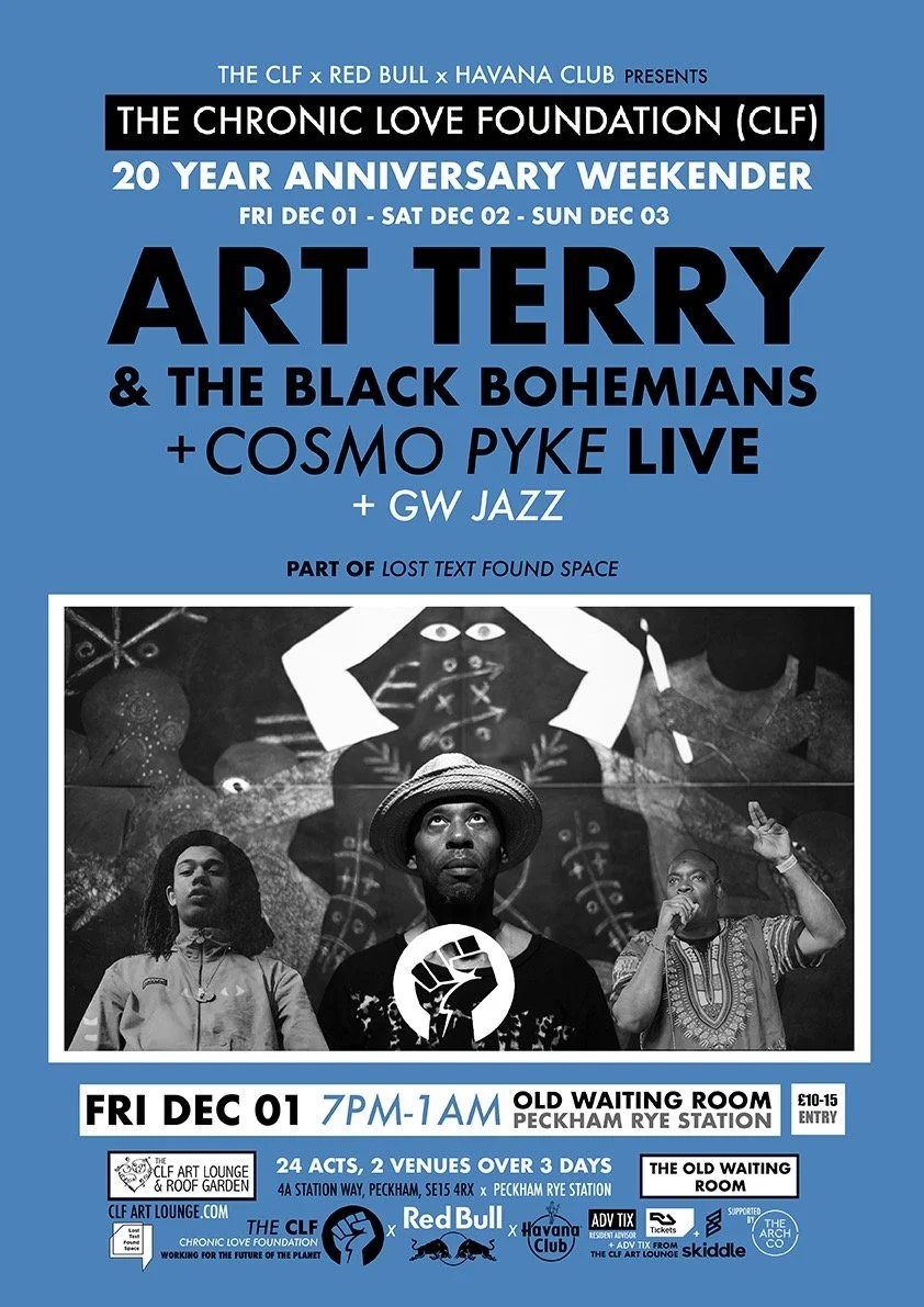 Art Terry & the Black Bohemians are headlining the CLF 20 YEAR ANNIVERSARY WEEKENDER (£5-15 per event or free entry): 24 acts performing at 8 events, over three days, at two stunning venues – deep in the heart of Peckham at The CLF Art Lounge & Roof Gardens and next door at the recently restored Old Waiting Room (OWR), Peckham Rye Station.